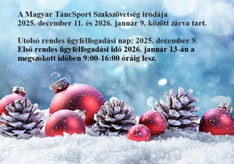A Magyar TáncSport Szakszövetség irodája 2025. december 11. és 2026. január 9. között zárva tart. Utolsó rendes ügyfélfogadási nap: 2025. december 9. Első rendes ügyfélfogadási idő 2026. január 13-án a megszokott időben 9:00-16:00 óráig lesz. A téli szünet alatt online vagy postai úton érkezett kérelmek, igénylések feldolgozása januárban érkezési sorrendben történik!